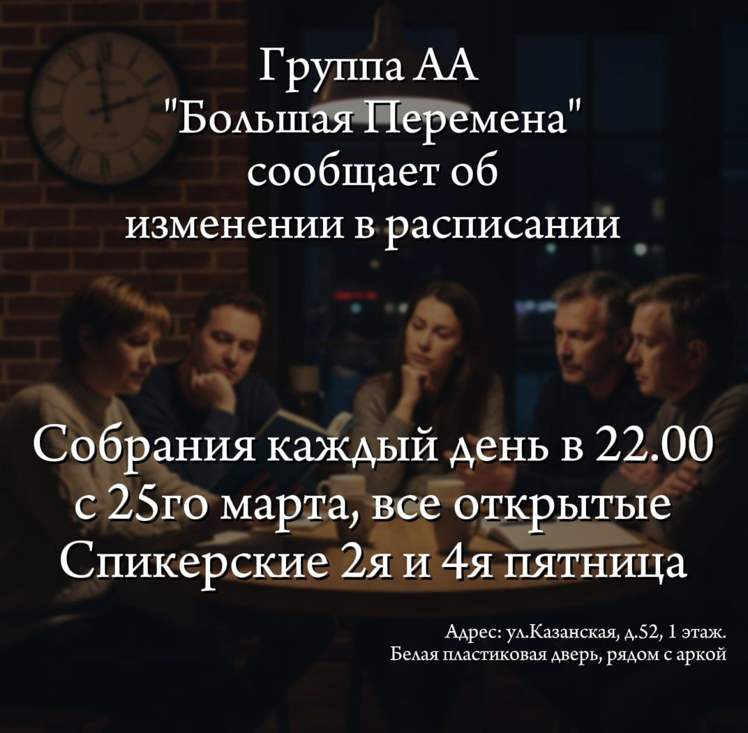 Все собрания группы открытые для страдающих от алкоголизма и всех, кто хочет ознакомиться с программой «12 шагов» и сообществом Анонимных Алкоголиков.
